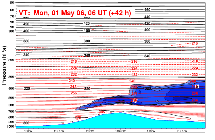 West-East-Section (HIAPER A): CIWC (ppmv, shaded), T(K, red) and Theta(K, black)