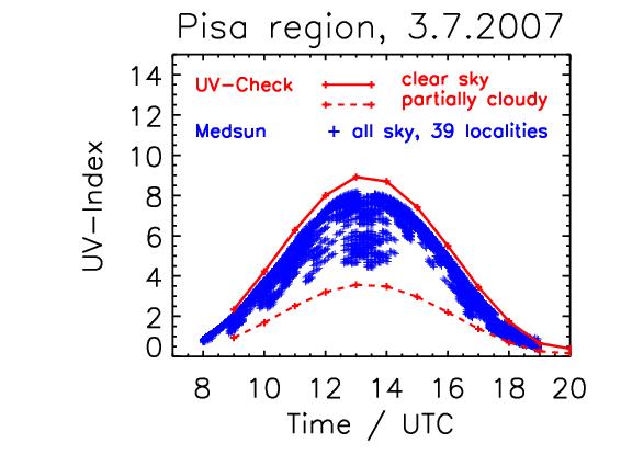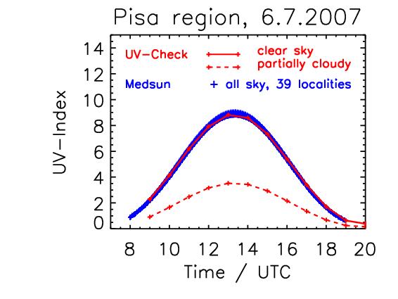 Intercomparison of the diurnal cycle of the UV-Index between the UV-Check and the Medsun service under almost clear sky conditions: here