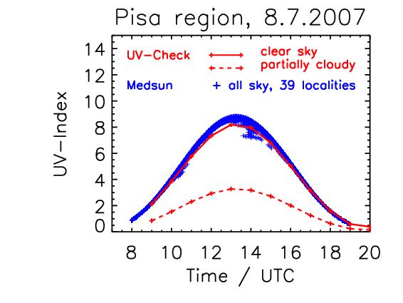 The erythemal UV calculated by the central UV-algorithm of the UV-Check service has been compared to surface measurements in several studies. The erythemal UV is the basic quantity from which UV-Check products as sunburn time and UV-Index are derived.