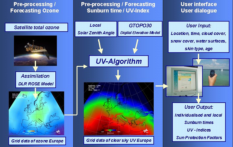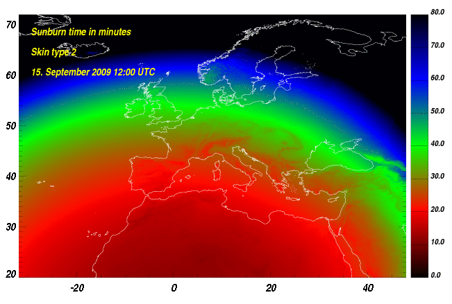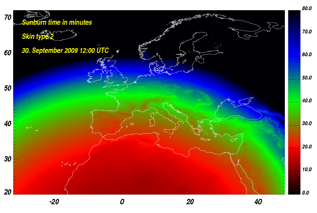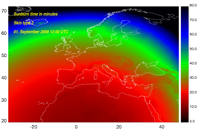Currently sunburn times are shown that are based on climatological total ozone values derived from ERS-2/GOME data. Maps illustrate the short